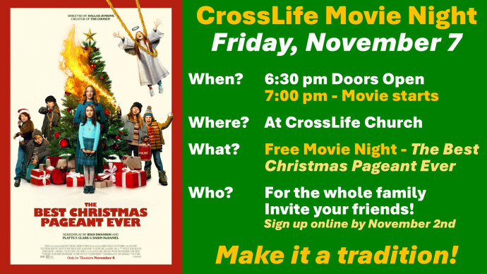 CrossLife will showing The Best Christmas Pageant Ever for FREE on Friday, November 7th.Doors will open at 6:30 pm. Movie will begin at 7:00 pm. General...